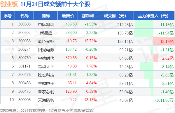 当日创业板成交额前10大个股中6只个股收涨,平均涨幅7.0%,其中中际旭创(300308)以成交额212.23亿元排第一。从主力资金流入看,成交额前10大个股中有2只个股呈现主力资金净流入。