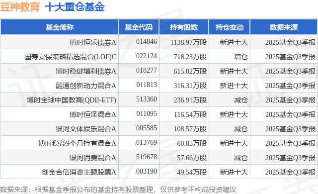 重仓豆神教育的前十大公募基金请见下表: