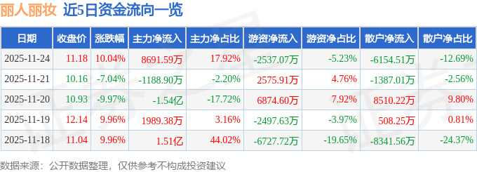 证券之星消息,截至2025年11月24日收盘,丽人丽妆(605136)报收于11.18元,上涨10.04%,涨停,换手率11.26%,成交量45.1万手,成交额4.85亿元。