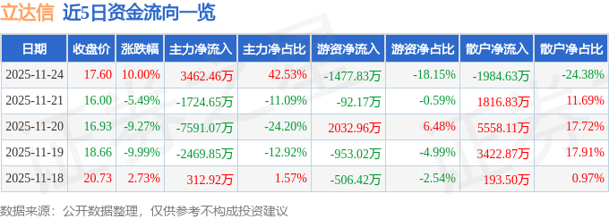 证券之星消息,截至2025年11月24日收盘,立达信(605365)报收于17.6元,上涨10.0%,涨停,换手率0.93%,成交量4.65万手,成交额8140.85万元。