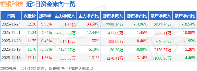 证券之星消息,截至2025年11月24日收盘,恒银科技(603106)报收于12.36元,上涨9.96%,涨停,换手率7.75%,成交量40.31万手,成交额4.85亿元。