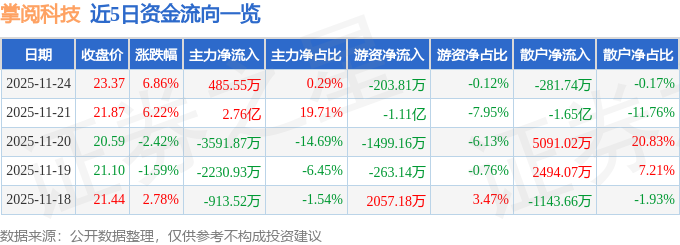 证券之星消息,截至2025年11月24日收盘,掌阅科技(603533)报收于23.37元,上涨6.86%,换手率16.62%,成交量72.94万手,成交额16.5亿元。