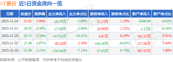 证券之星消息,截至2025年11月24日收盘,ST景谷(600265)报收于21.01元,上涨5.0%,换手率0.72%,成交量9287.0手,成交额1926.27万元。