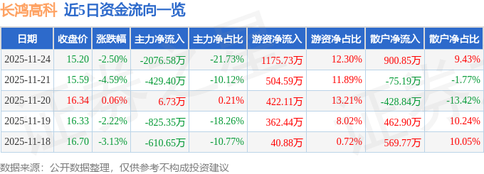 证券之星消息,截至2025年11月24日收盘,长鸿高科(605008)报收于15.2元,下跌2.5%,换手率0.97%,成交量6.25万手,成交额9557.21万元。