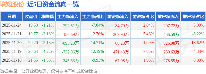 11月24日的资金流向数据方面,主力资金净流出292.51万元,占总成交额7.04%,游资资金净流入84.79万元,占总成交额2.04%,散户资金净流入207.72万元,占总成交额5.0%。
