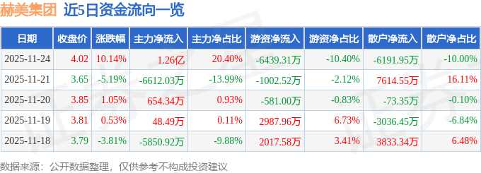 证券之星消息,截至2025年11月24日收盘,赫美集团(002356)报收于4.02元,上涨10.14%,涨停,换手率12.09%,成交量158.47万手,成交额6.19亿元。