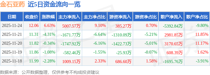 证券之星消息,截至2025年11月24日收盘,金石亚药(300434)报收于12.06元,上涨6.63%,换手率13.21%,成交量45.2万手,成交额5.5亿元。