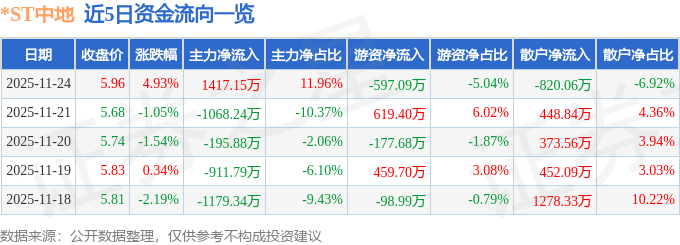 证券之星消息,截至2025年11月24日收盘,*ST中地(000736)报收于5.96元,上涨4.93%,换手率2.78%,成交量20.06万手,成交额1.18亿元。