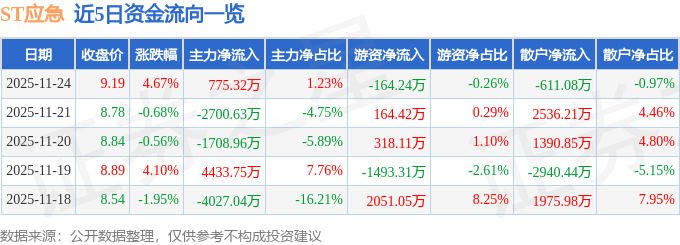 证券之星消息,截至2025年11月24日收盘,ST应急(300527)报收于9.19元,上涨4.67%,换手率6.82%,成交量69.39万手,成交额6.28亿元。