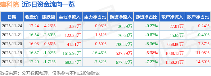 证券之星消息,截至2025年11月24日收盘,建科院(300675)报收于17.24元,上涨4.23%,换手率4.51%,成交量6.61万手,成交额1.13亿元。