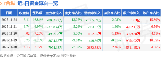 证券之星消息,截至2025年11月24日收盘,ST合纵(300477)报收于3.11元,下跌16.84%,换手率19.92%,成交量197.36万手,成交额6.72亿元。