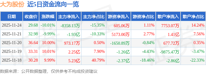 证券之星消息,截至2025年11月24日收盘,大为股份(002213)报收于29.68元,下跌10.01%,已连续跌停2天,换手率8.72%,成交量18.02万手,成交额5.44亿元。