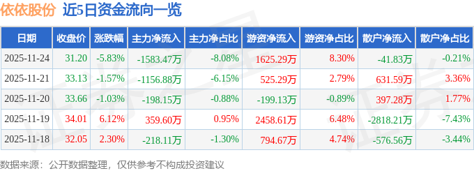 证券之星消息,截至2025年11月24日收盘,依依股份(001206)报收于31.2元,下跌5.83%,换手率5.81%,成交量6.18万手,成交额1.96亿元。