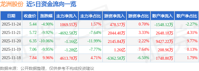 证券之星消息,截至2025年11月24日收盘,龙洲股份(002682)报收于5.44元,下跌4.9%,换手率22.35%,成交量125.67万手,成交额6.81亿元。