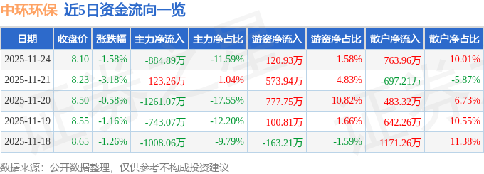 证券之星消息,截至2025年11月24日收盘,中环环保(300692)报收于8.1元,下跌1.58%,换手率2.27%,成交量9.35万手,成交额7633.47万元。