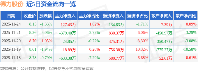 证券之星消息,截至2025年11月24日收盘,德力股份(002571)报收于8.15元,下跌1.33%,换手率3.24%,成交量9.67万手,成交额7862.74万元。