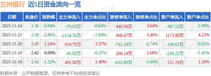 证券之星消息,截至2025年11月24日收盘,兰州银行(001227)报收于2.36元,下跌0.84%,换手率1.23%,成交量51.77万手,成交额1.23亿元。