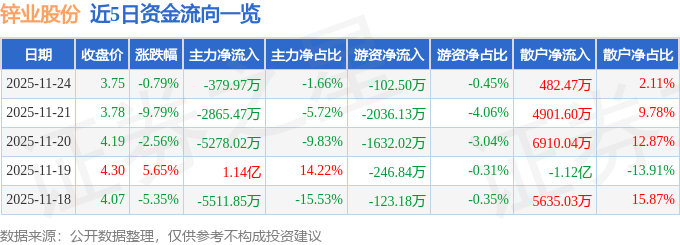 证券之星消息,截至2025年11月24日收盘,锌业股份(000751)报收于3.75元,下跌0.79%,换手率4.34%,成交量61.2万手,成交额2.29亿元。
