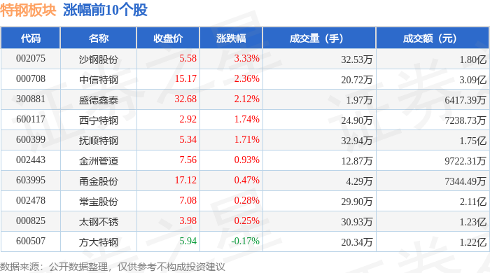 证券之星消息,11月24日特钢板块较上一交易日上涨1.33%,沙钢股份领涨。当日上证指数报收于3836.77,上涨0.05%。深证成指报收于12585.08,上涨0.37%。特钢板块个股涨跌见下表: