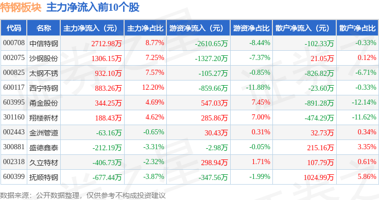从资金流向上来看,当日特钢板块主力资金净流入3121.43万元,游资资金净流出2973.86万元,散户资金净流出147.57万元。特钢板块个股资金流向见下表:
