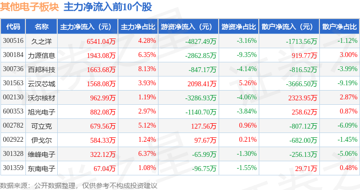 从资金流向上来看,当日其他电子板块主力资金净流出3.35亿元,游资资金净流出1.55亿元,散户资金净流入4.9亿元。其他电子板块个股资金流向见下表: