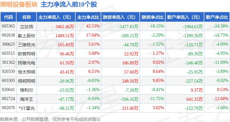 从资金流向上来看,当日照明设备板块主力资金净流入3629.41万元,游资资金净流出711.12万元,散户资金净流出2918.3万元。照明设备板块个股资金流向见下表: