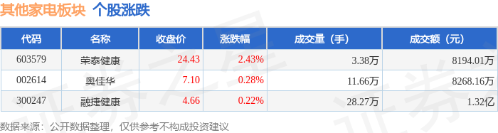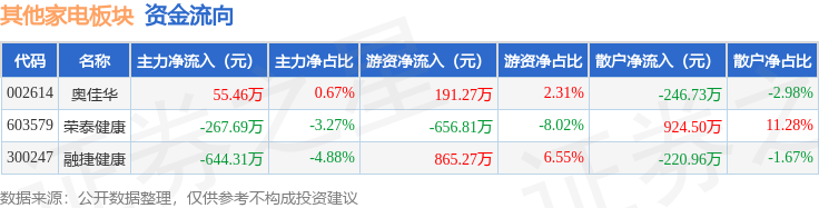 从资金流向上来看,当日其他家电板块主力资金净流出856.53万元,游资资金净流入399.72万元,散户资金净流入456.81万元。其他家电板块个股资金流向见下表: