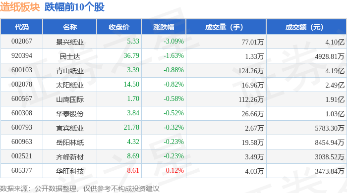 从资金流向上来看,当日造纸板块主力资金净流出1.1亿元,游资资金净流出1330.23万元,散户资金净流入1.23亿元。造纸板块个股资金流向见下表: