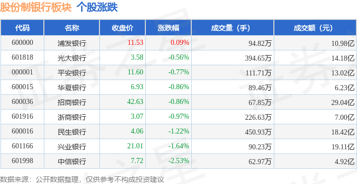 证券之星消息,11月24日股份制银行板块较上一交易日下跌1.05%,中信银行领跌。当日上证指数报收于3836.77,上涨0.05%。深证成指报收于12585.08,上涨0.37%。股份制银行板块个股涨跌见下表:
