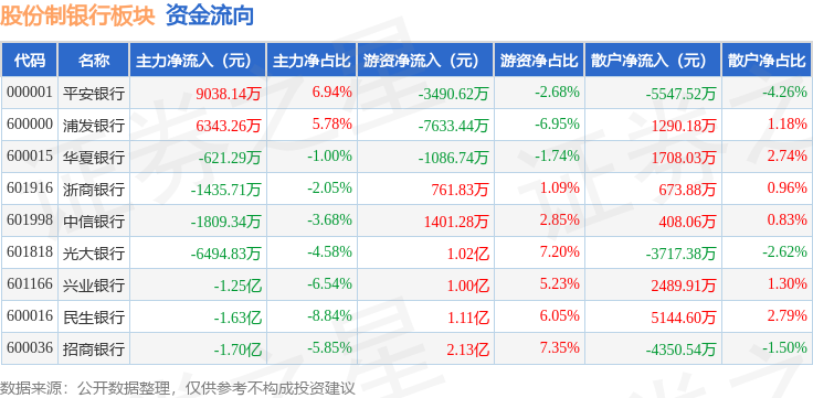 从资金流向上来看,当日股份制银行板块主力资金净流出4.07亿元,游资资金净流入4.26亿元,散户资金净流出1900.79万元。股份制银行板块个股资金流向见下表: