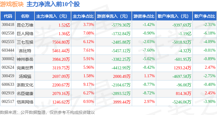 从资金流向上来看,当日游戏板块主力资金净流入3.88亿元,游资资金净流出3.8亿元,散户资金净流出808.78万元。游戏板块个股资金流向见下表: