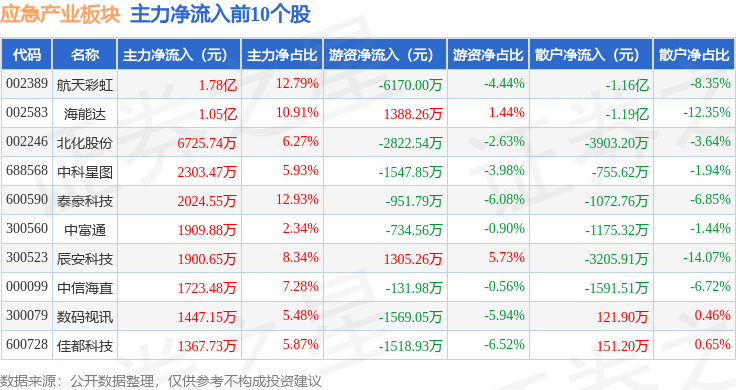从资金流向上来看,当日应急产业板块主力资金净流入1.26亿元,游资资金净流出1.28亿元,散户资金净流入269.27万元。应急产业板块个股资金流向见下表: