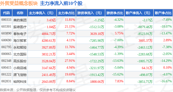 从资金流向上来看,当日外贸受益概念板块主力资金净流入3.24亿元,游资资金净流出2.3亿元,散户资金净流出9366.09万元。外贸受益概念板块个股资金流向见下表: