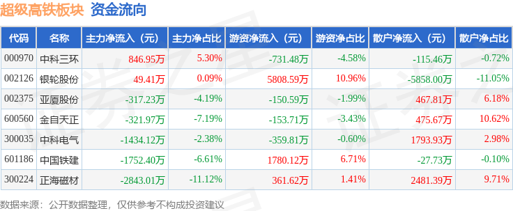 从资金流向上来看,当日超级高铁板块主力资金净流出5772.36万元,游资资金净流入6554.74万元,散户资金净流出782.38万元。超级高铁板块个股资金流向见下表: