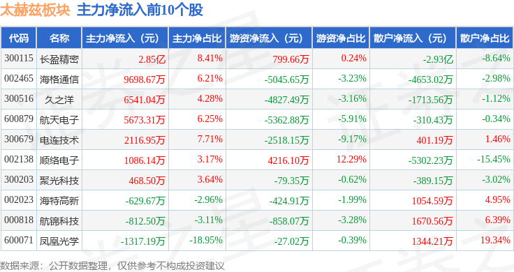 从资金流向上来看,当日太赫兹板块主力资金净流入2.95亿元,游资资金净流入701.33万元,散户资金净流出3.02亿元。太赫兹板块个股资金流向见下表: