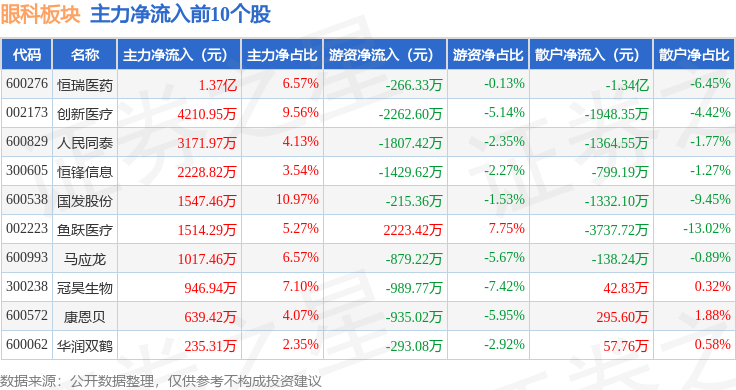 从资金流向上来看,当日眼科板块主力资金净流出1.82亿元,游资资金净流入2217.51万元,散户资金净流入1.6亿元。眼科板块个股资金流向见下表: