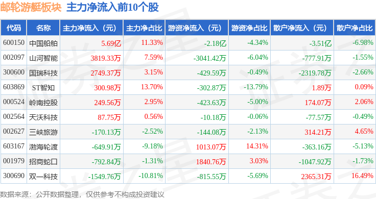 从资金流向上来看,当日邮轮游艇板块主力资金净流入5313.38万元,游资资金净流入4793.7万元,散户资金净流出1.01亿元。邮轮游艇板块个股资金流向见下表: