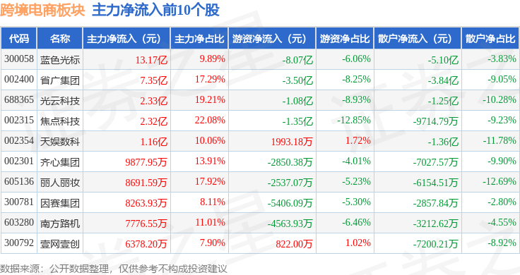 从资金流向上来看,当日跨境电商板块主力资金净流入12.25亿元,游资资金净流出15.51亿元,散户资金净流入3.26亿元。跨境电商板块个股资金流向见下表:
