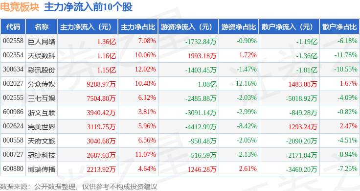 从资金流向上来看,当日电竞板块主力资金净流入5.82亿元,游资资金净流出3.08亿元,散户资金净流出2.74亿元。电竞板块个股资金流向见下表: