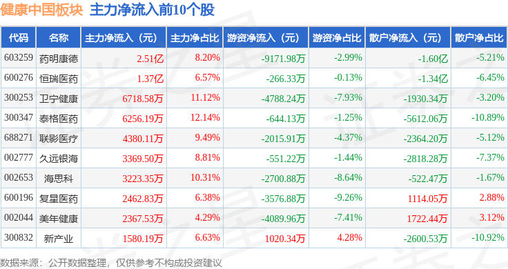 从资金流向上来看,当日健康中国板块主力资金净流出1.78亿元,游资资金净流出9683.53万元,散户资金净流入2.75亿元。健康中国板块个股资金流向见下表: