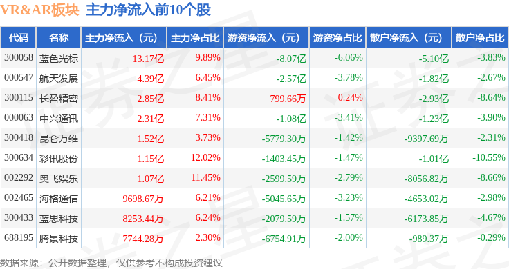从资金流向上来看,当日VR&AR板块主力资金净流出10.61亿元,游资资金净流出9.36亿元,散户资金净流入19.97亿元。VR&AR板块个股资金流向见下表: