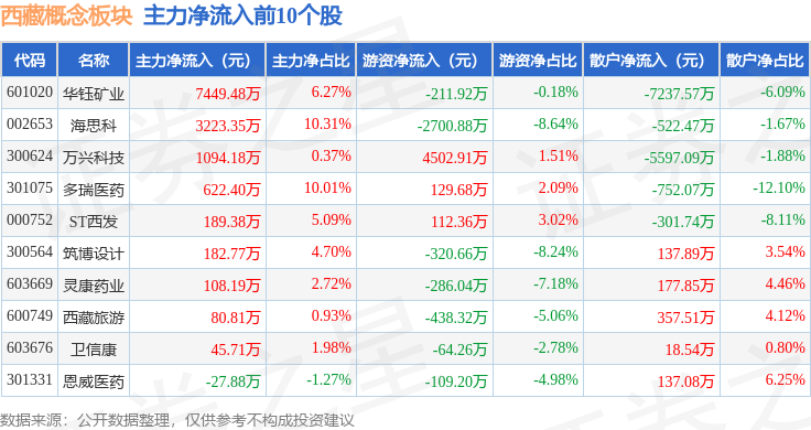 从资金流向上来看,当日西藏概念板块主力资金净流出1.9亿元,游资资金净流出5429.36万元,散户资金净流入2.44亿元。西藏概念板块个股资金流向见下表: