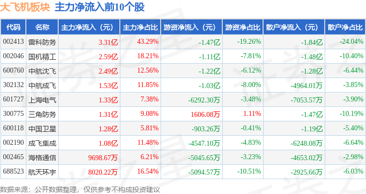 从资金流向上来看,当日大飞机板块主力资金净流入18.77亿元,游资资金净流出11.42亿元,散户资金净流出7.35亿元。大飞机板块个股资金流向见下表: