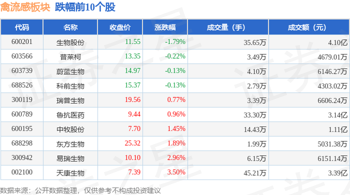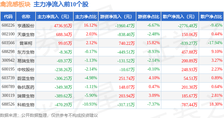 从资金流向上来看,当日禽流感板块主力资金净流入2806.6万元,游资资金净流出2564.27万元,散户资金净流出242.33万元。禽流感板块个股资金流向见下表:
