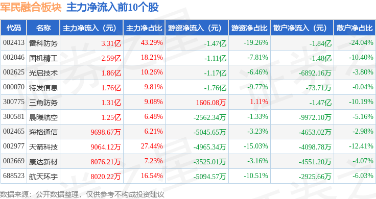 从资金流向上来看,当日军民融合板块主力资金净流入4.47亿元,游资资金净流出14.62亿元,散户资金净流入10.15亿元。军民融合板块个股资金流向见下表: