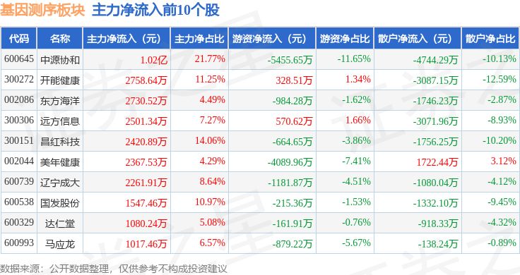 从资金流向上来看,当日基因测序板块主力资金净流入8864.25万元,游资资金净流出2.16亿元,散户资金净流入1.27亿元。基因测序板块个股资金流向见下表: