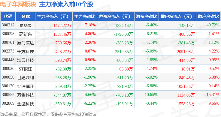 从资金流向上来看,当日电子车牌板块主力资金净流出7652.0万元,游资资金净流出9536.6万元,散户资金净流入1.72亿元。电子车牌板块个股资金流向见下表: