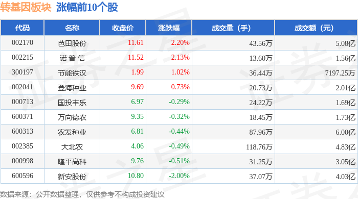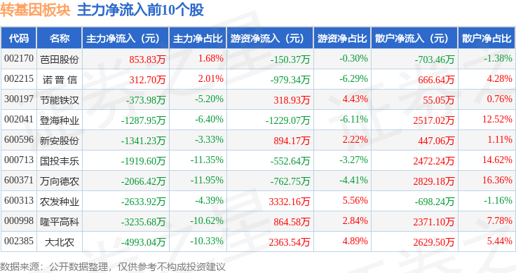 从资金流向上来看,当日转基因板块主力资金净流出2.19亿元,游资资金净流入6751.24万元,散户资金净流入1.51亿元。转基因板块个股资金流向见下表: