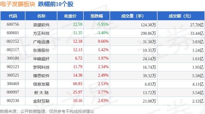从资金流向上来看,当日电子发票板块主力资金净流出1.92亿元,游资资金净流出6351.84万元,散户资金净流入2.55亿元。电子发票板块个股资金流向见下表: