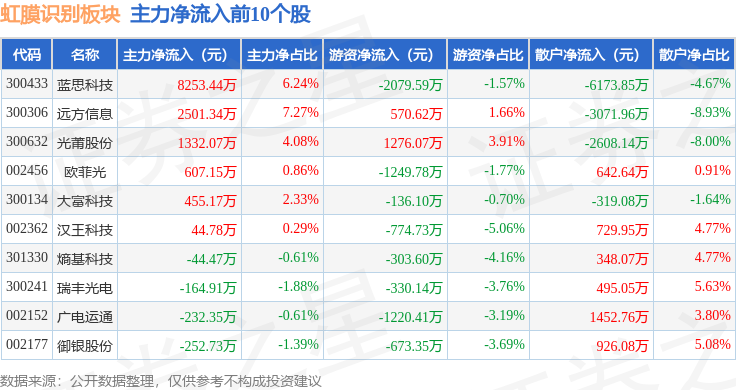 从资金流向上来看,当日虹膜识别板块主力资金净流入3158.73万元,游资资金净流出8406.31万元,散户资金净流入5247.58万元。虹膜识别板块个股资金流向见下表: